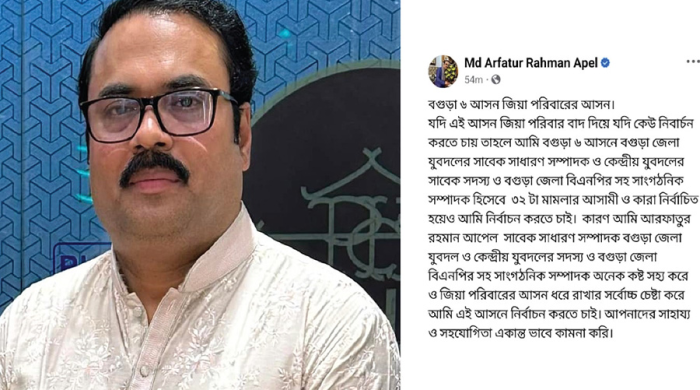 In a Facebook post, Md. Arfatur Rahman Apel wrote, "Bogra-6 constituency is the seat of the Zia family. If anyone wants to contest the election in this constituency, excluding the Zia family, then I want to participate in the election as the former general secretary of the Bogra district Jatiotabadi Jubodal, former member of the central Jatiotabadi Jubodal and co-organizing secretary of the district BNP."